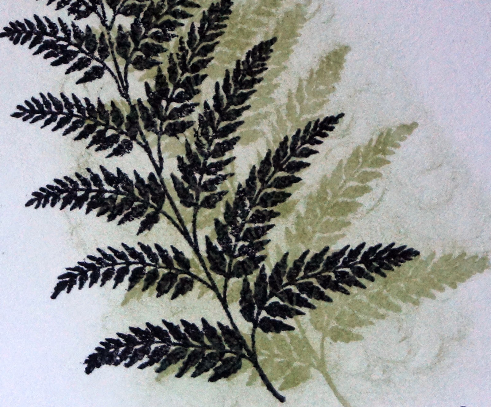 To create the shadow, I stamped the fern in Versamark ink and then chalked over the image in green chalk, first with the applicator tool from the chalk palette and then to even it out and blend away the edges, with a cotton wool ball. Then I overstamped the image in black Memento ink.