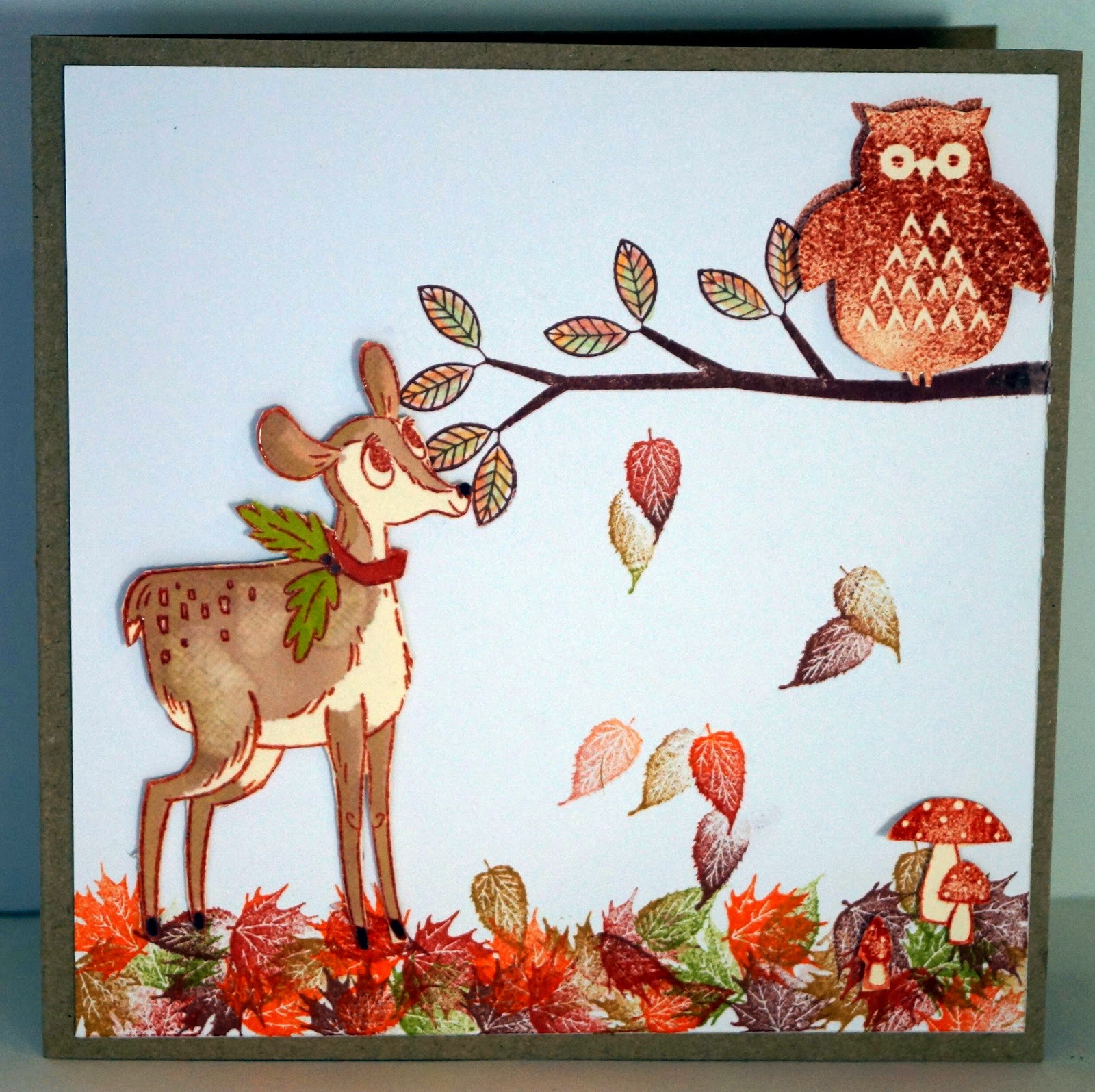 The fawn, owl and toadstools were stamped on cream card and cut out - they are raised slightly above the background card although it doesn't really show on the photo.