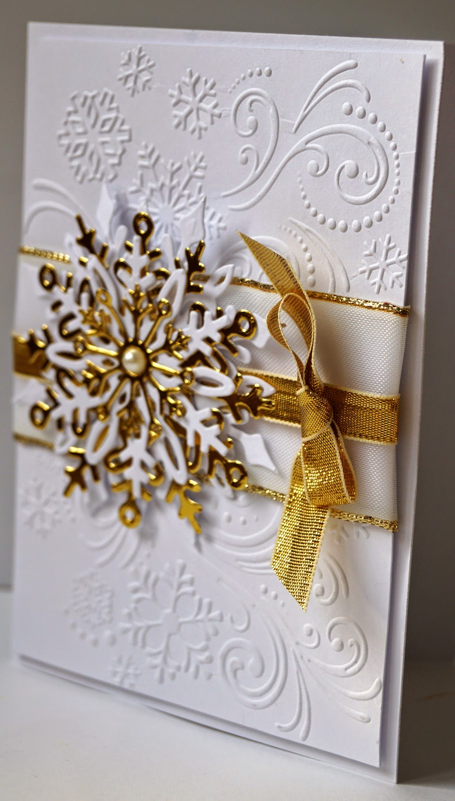 The background is made with a Darice embossing folder, wrapped with a gold-edged white organza ribbon topped with a gold metallic ribbon. The snowflake is die cut with a Spellbinders (if I recall correctly, I never keep the packaging) die set, alternate layers of white and gold, and finally a bow of the gold metallic ribbon finishes the whole thing off.
