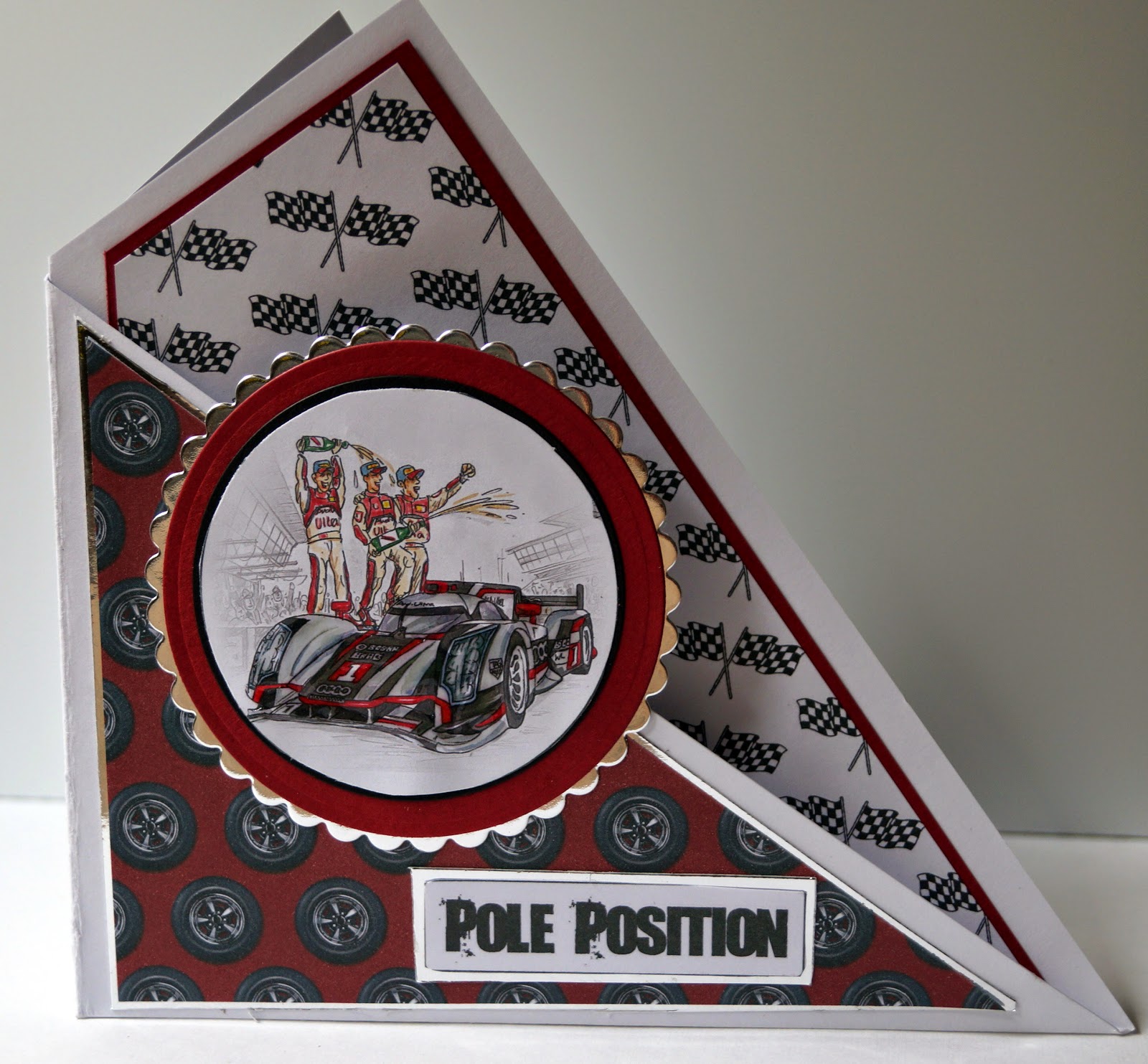 I've had this sheet of motorsport themed toppers hanging around for a couple of years. I've used the pick of the sheet and the rest of the toppers have been hanging around and starting to get dog eared. So I rescued this red racing car one and livened it up a bit by picking out the bodywork with Glossy Accents. Along with some embossed metallic card it makes a striking and simple masculine card.