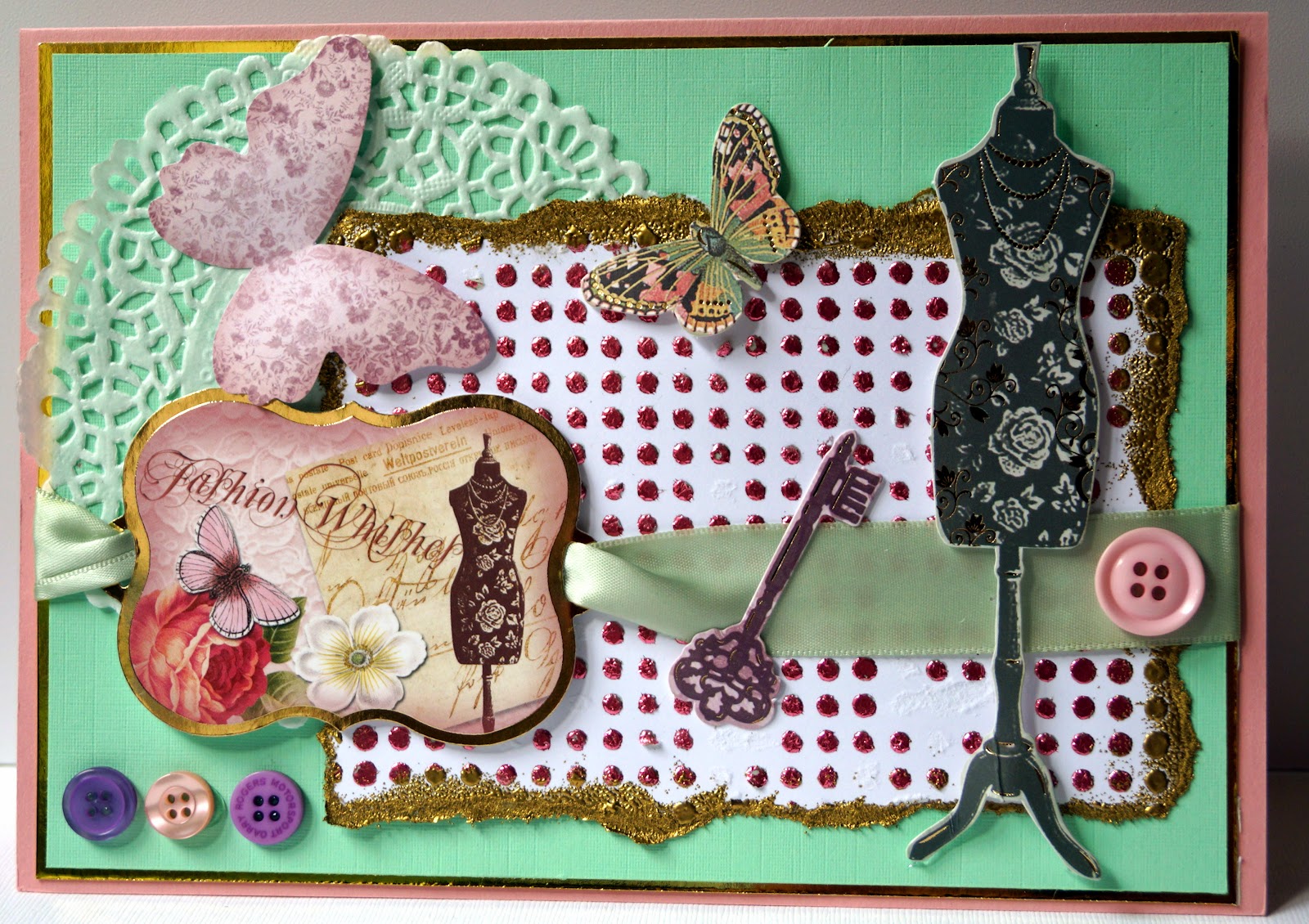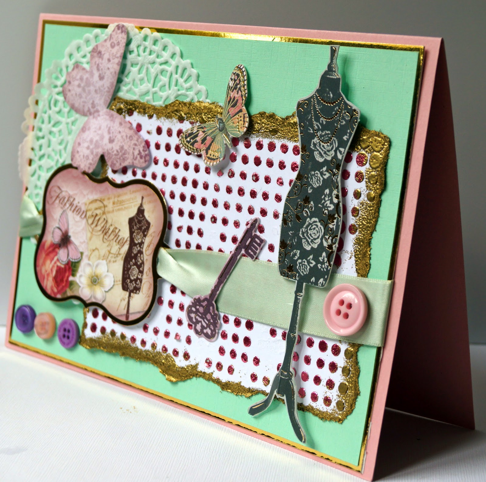 By now it had an interesting vintage look to it, so I picked out a few elements from a Hunkydory kit, added a doiley and some buttons and have ended up with a vintage style dressmaking themed card which has all come about as the result of my initial experiment having gone wrong!
