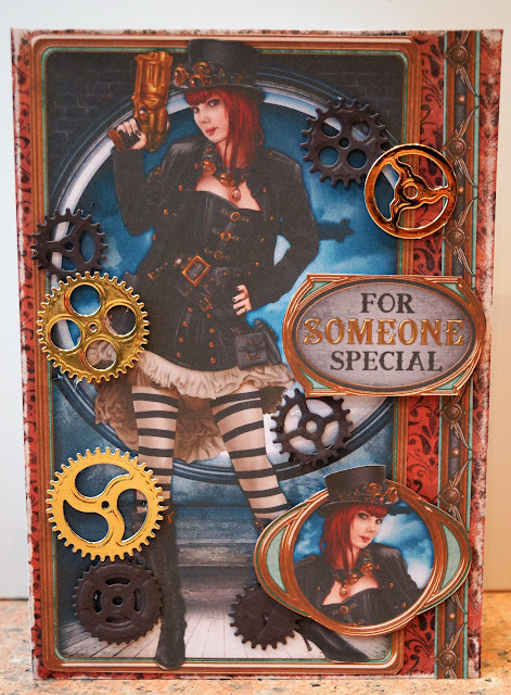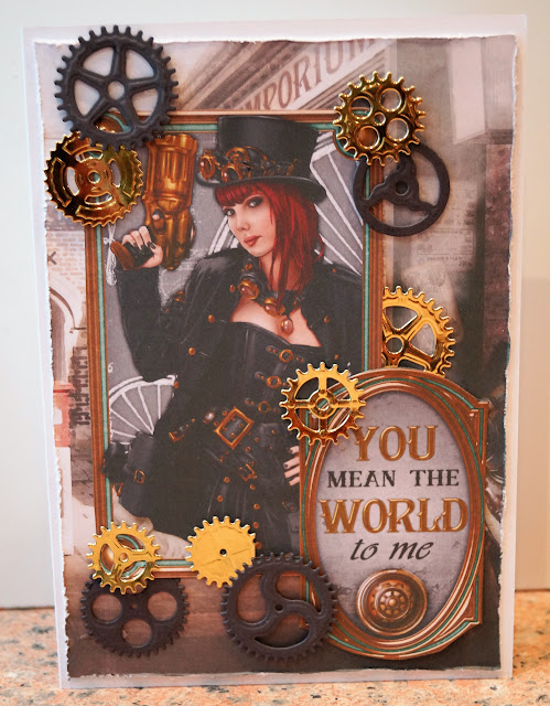 I printed the background out at half size, as on the CD it fills a whole A4 sheet, then added an image and sentiment from one of the design sheets on the CD. I love the way Debbi uses shading on her CDs to give a really metallic-looking finish to many of the frames and embellishments, so of course I cut some of the cogs from metallic card too.