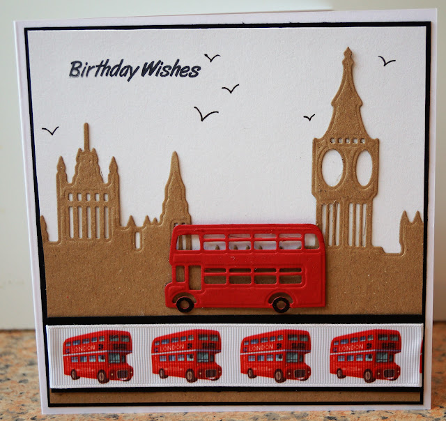I've used the X-cut Build-a-Scene London dies and this wonderful piece of ribbon from my stash (It originally came from either Crafty Ribbons or The Ribbon Girl, I can't remember which). I got a tiny blob of black ink on the card while stamping the sentiment, so I turned it into a bird and added a few more. They could be seagulls, ravens or pigeons, London has plenty of each!