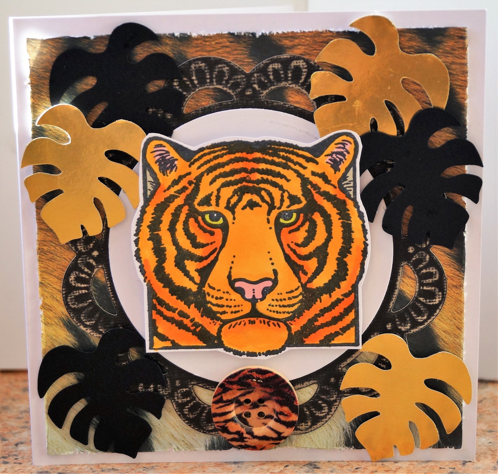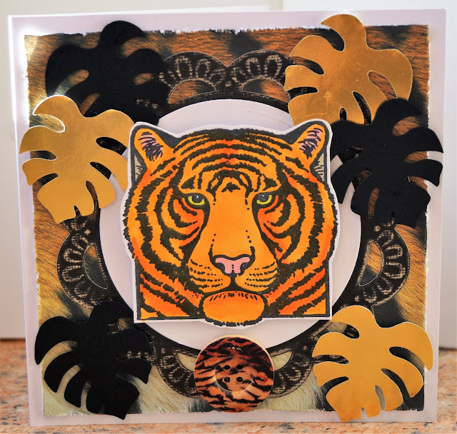 Of course the leaves need a striking image to go with them, and my lovely tiger stamp (an old unmounted stamp, sorry I can't remember the brand) was just right for the job. I've added a background of tiger print paper from a Zeeman pad. It looks textured, doesn't it. but in fact it is plain smooth paper. I have framed the image with a scalloped circle cut and embossed from black colour-core card with a light tan core, using a Marianne Creatables die, sanded after embossing to reveal the core. The button is from a bargain bag I bought on Amazon.