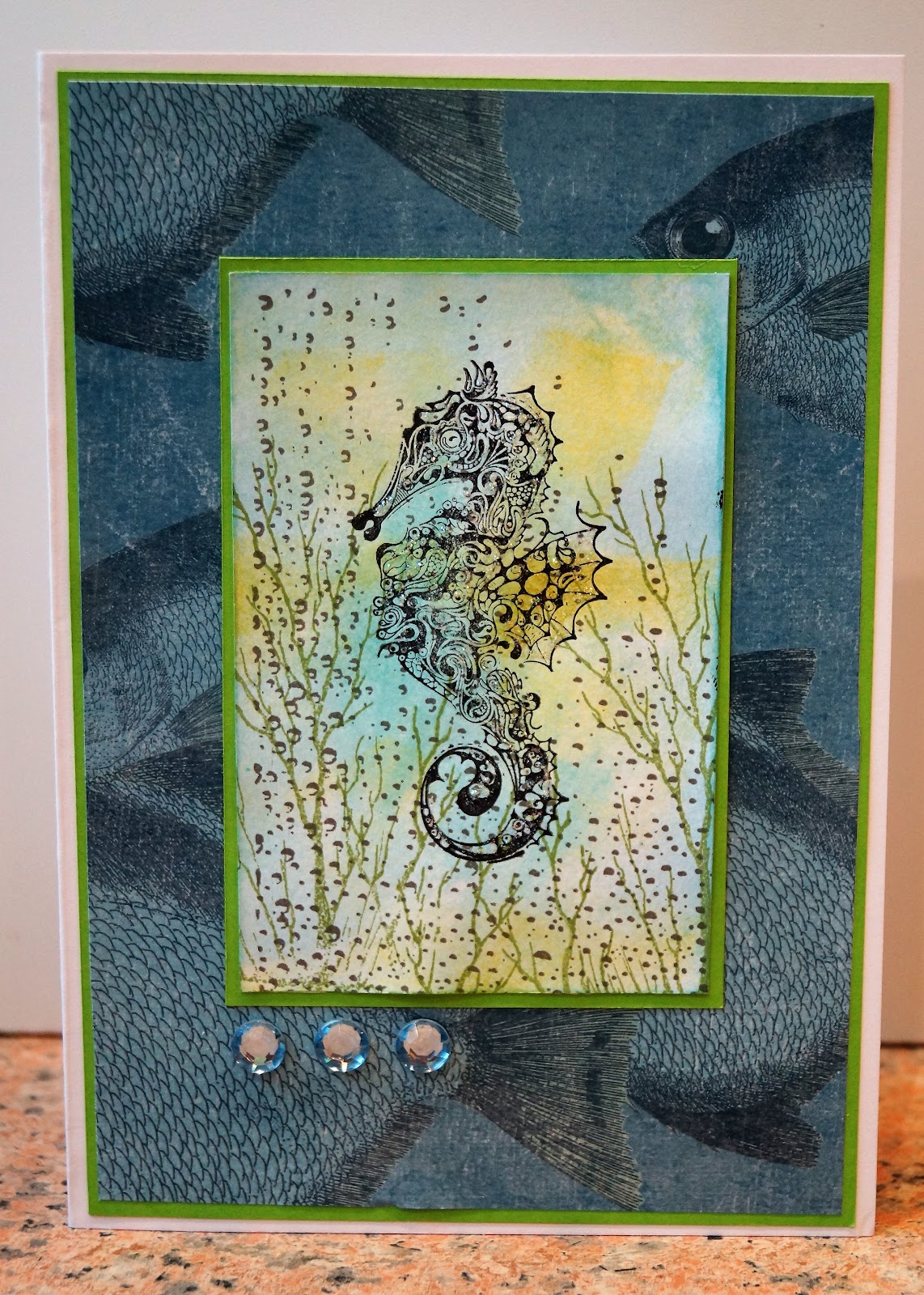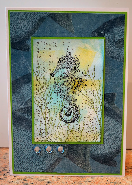 The background for the stamped panel is watercoloured in blue, green and yellow, then stamped the Katzelkraft waterwall stamp but with the bubbles going upwards instead of down, in grey over the background and used some bare tree branch stamps (these are very old unmounted stamps from my stash - I think they are discontinued Linda Luckin stamps) along the bottom to look like seaweed. Finally I stamped the seahorse over the top and highlighted him with a thin coat of Stickles, although it doesn't show in the photo.