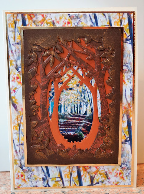 I have framed the image using woodland scene dies cut using a set of X-Cut Build-a-scene dies, but before cutting I stamped the two darker brown pieces with a large leaf design background stamp, using Versamark ink, and dusted them with gold and copper metallic pigment powders. The dies seem to fit the proportions of the image so well they could have been designed to work together!