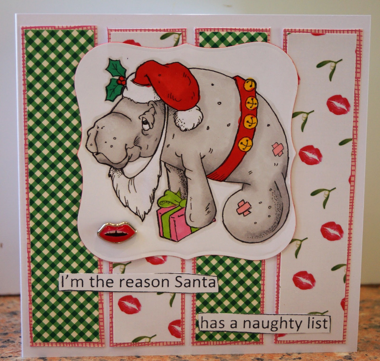 I decided this time to make him a she - and a she in a saucy mood, adding some kissy mistletoe paper printed from The Best Of La Pashe 2014, a hot lips brad and a Dylusions sentiment.