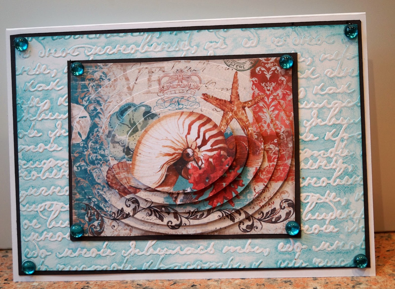 I've used the beautiful Elegant Nautilus design from the Shawn Jenkins CD, available here , selecting the pyramage. Part of the design incorporates some script, so I've reflected that by using a script text embossing folder. I swiped the "inny" side (ie the raised side, which will form the inny part after embossing) with blue distress ink before embossing the white card, to leave the letters white - I think this technique is called faux letterpress. The layering is dark grey to match the scroll across the bottom of the image, and aqua gems add to the underwater look.
