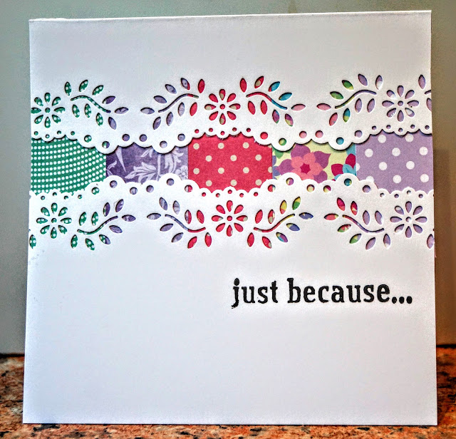 I've used the embossing folder that was a magazine gift a couple of years ago and is now so popular that it is being sold under the name "THE Embossing Folder". I cut away the central band and then used the top and bottom to completely cover my card, leaving a gap between them. The sentiment is cut with a tattered lace die.