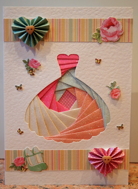 The pleated hearts come as ready made stickers, and the spotty and stripey papers from the 6x6 pad. The shoe and flower embellishments, all gloriously sparkly to go with the sparkle of the gown, are actually from one of the designs in the decoupage pad. I reckon the designs have so many layers that nobody's going to notice if one or two of them get "repurposed".