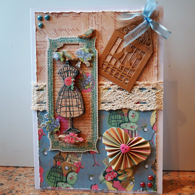 The die cut bird cage is there to reflect the bird cages on the blue background paper - the only snag is, all the bird cages have been covered up by other stuff! But I know they are there, so it still counts! It isn't actually a die cut, it's a panel trimmed from one meant to be made into a wedding favour. I got a pack of 10 quite cheaply from a local shop and as each cuts into four panels, that's 40 little bird cage embellishments ready to be used!