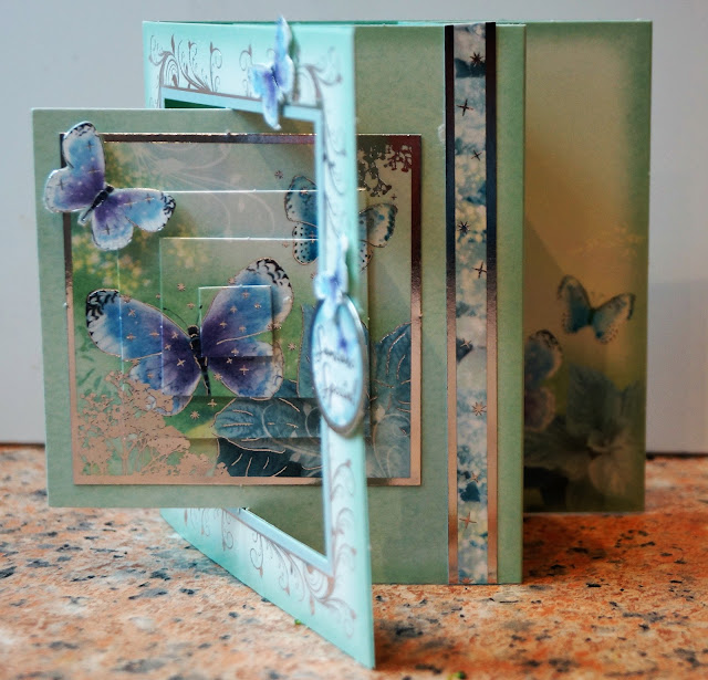 As I told you last week, I'm delighted to be the guest designer for the current challenge at The Butterfly Challenge - X is for Xtra Fold and/or the colour Peacock blue/green and as I love the themes so much, I decided to make you a mid-challenge inspiration card.