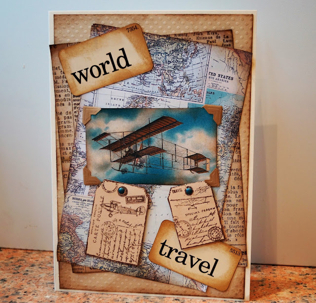 The main image I have used is from a design sheet printed out from Joanna Sheen's Victorian Birthday Cards CD and the stamped tags are individual images cut from a stamped Crafty Individuals stamp - I can't locate it on their site at the moment but it's a collage of a whole range of vintage transport themed tags - I selected the ones showing aircraft and kept the rest for another time. The Tim Holtz words and all the papers are from my stash.