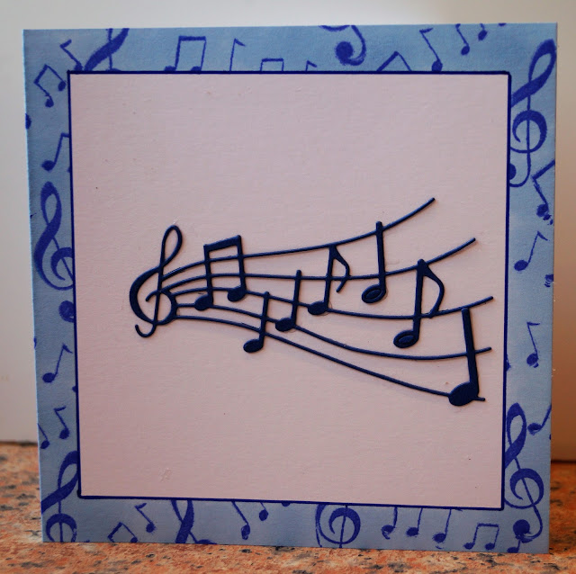 This time I inked the border with a pale blue ink and stamped musical symbols (from a Kanban set) with a darker blue. To keep the card CAS, all I added to the central white space was a die cut music score cut with the Memory Box Music Party die, one of my most often-used dies. I kept the centres of all the "open" notes in place with a dab of glue, again to keep it as CAS as possible. In real life, the die cut is a much brighter blue than it looks, a pretty close match to the darker blue stamping.
