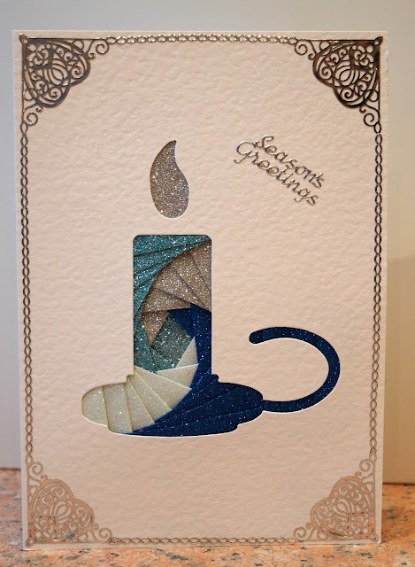 I chose cool blues and silver tones for this card, embellishing it in the good old fashioned way with peel offs which must be about as old as the iris folding kits themselves. With all that glitter in the candle it really doesn't need anything else!