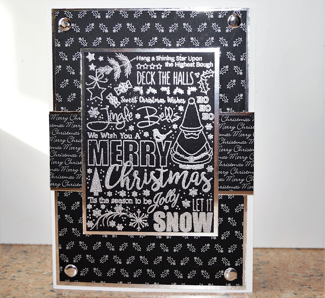 The two background papers I used, holly leaves and Merry Christmas, are black with silver print and are very old ones from my stash. The topper is stamped with a Uniko stamp - it is all one stamp, stamped and heat embossed in silver. I love all the little details and the songs that so much of the text refers to - every time I use the stamp it makes me sing.