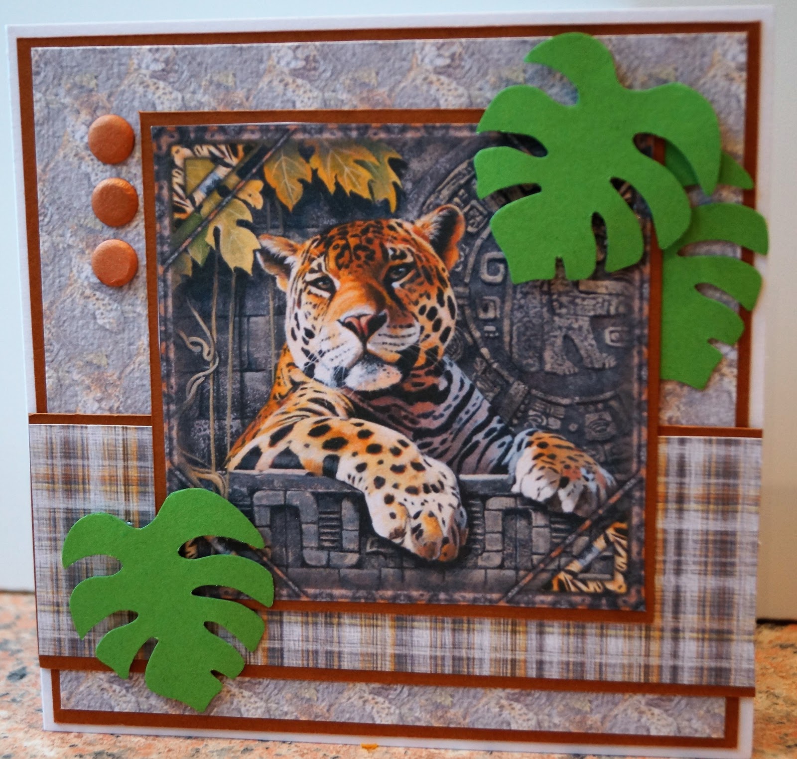 J is for JAGUAR. I had to do a bit of research to find out the difference between a jaguar and a leopard to make sure I got the right one, and apparently jaguars are indigenous to the South American continent and as this handsome beast from Pollyanna Pickering's CD "A Walk in the Wild" is surrounded by Mayan carvings, I knew I had the right cat.