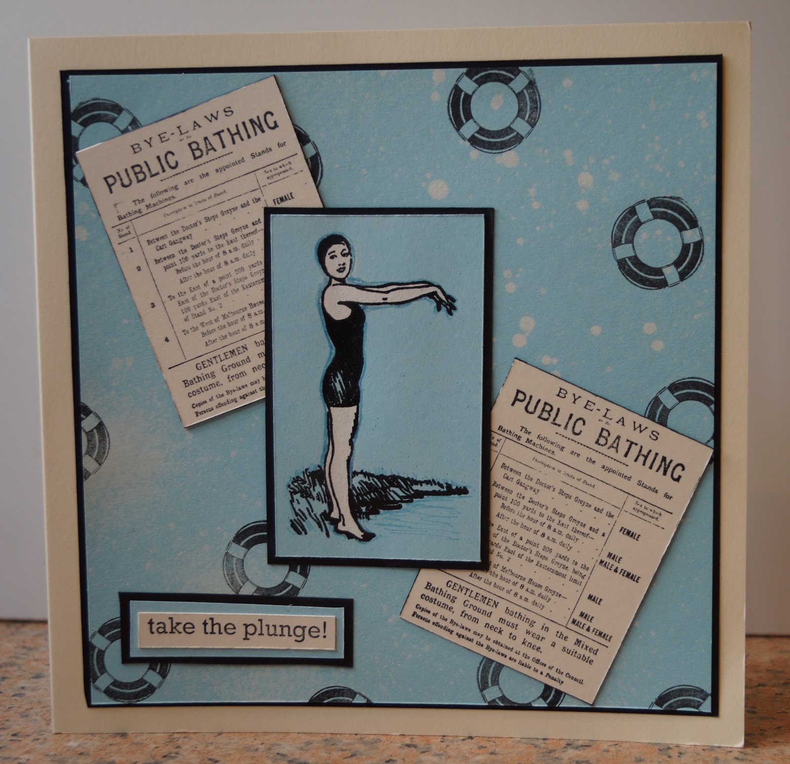 The bathing beauty is stamped and heat embossed in black on blue card, and then painted in with a waterbrush filled with cheap bleach - it has to be the really cheap, thin type, not the more common (and more expensive) thick kind. I outlined her and added a few waves to the sea with a blue gel pen slightly darker than the card.