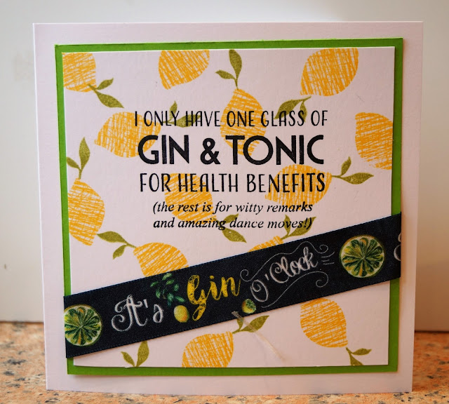 I happen to know that Lynne is rather partial to a glass of gin; not only that but the lovely ribbon I have used on the card was actually a gift from her, so this card is very personal to her challenge. I stamped the background using elements from the Hero Arts "Stamp your own salad" set and the sentiment using one of the fab new sentiment stamps from Crafters Companion.