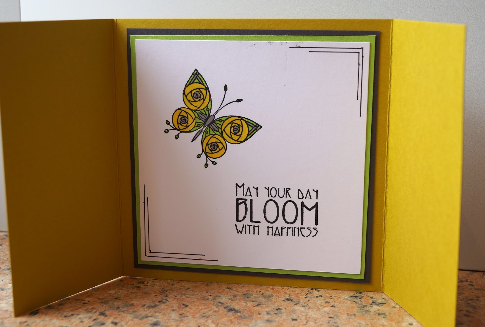 I've used the stamps to create a gatefold card, using the colours suggested at the current Butterfly challenge of Gold, Granny Smith and Gunmetal (apologies, Mrs A, I couldn't really work gems or gingham into this particular card!)