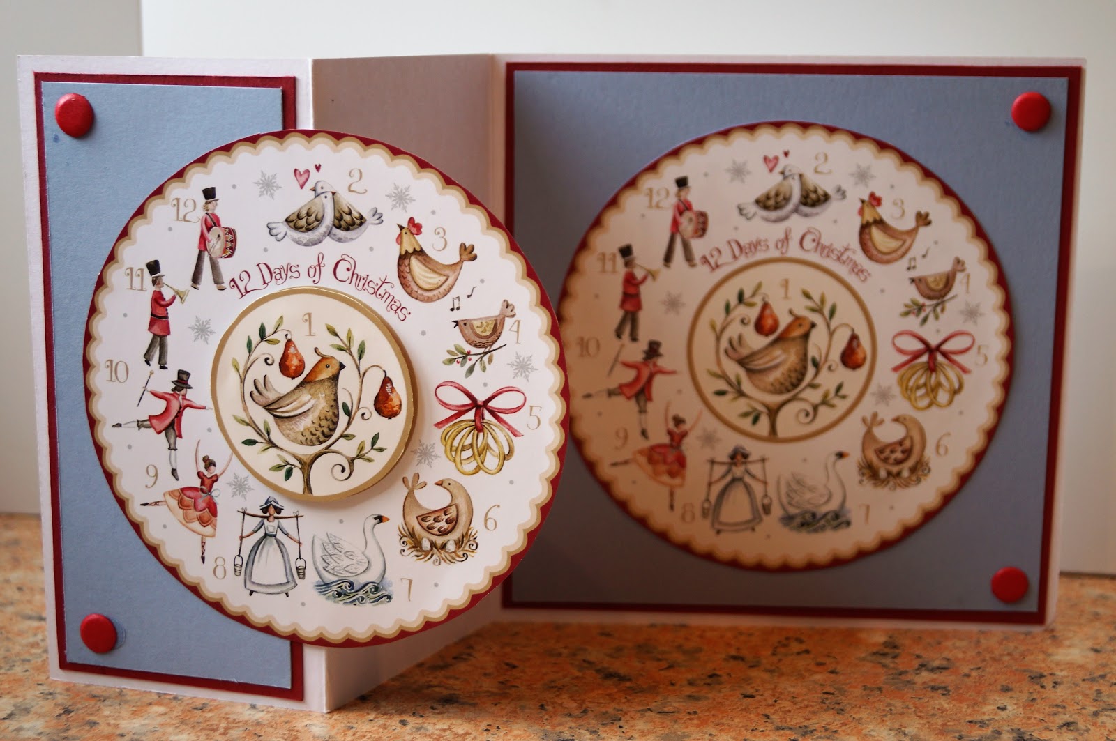 I hand cut the circle from two pages (I am hopeless at lining up dies on circular designs, or I might have die cut it instead!) plus the inner circle from one more page. and used them on both the inside and the outside, making sure they line up exactly when the card is closed, with the inner circle raised on foam pads on the card front.