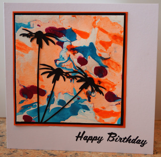 I watched several You Tube videos before I was brave enough to attempt it, but finally got myself some usable backgrounds and used this one with some die cut silhouette flowers. I can't say it's a technique I particularly enjoyed, but it's always an interesting challenge to try something new so I hope you will have a go!