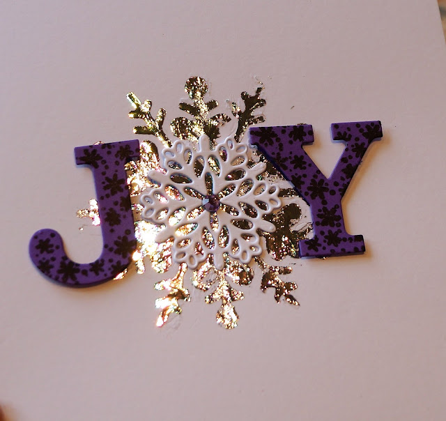 I die cut the word "Joy" once in purple and once in white, and planned to attach it, purple-white-purple, just like that, but the letters looked rather flat, so I livened them up by stamping a teeny tiny snowflake cluster all over them. Of course it would have been easier to stamp the card before die cutting but at that point I hadn't realised I was going to be stamping it.