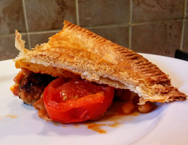 We loved this pie - served with peas for a touch of green, although I wouldn't have peas on a cooked breakfast. If we'd had any mushrooms, they would have gone into the pie, either sliced, fried and added to the bean mixture or halved, poached and arranged with the sausages, eggs and tomatoes.