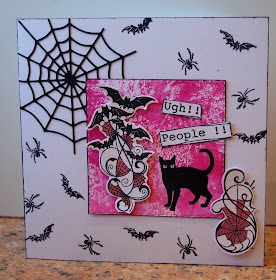 I decided to use all the images that make people (not THIS person, but lots of people) go UGH, like spiders, bats and a black cat. How can anybody not LOVE a beautiful black cat? Anyway, what if these creatures are actually going UGH about people? I know one of my grand-cats goes UGH whenever it sees me, and I would so love to have a cuddle from her. So one of my favourite Dylusions sentiments was pressed into action, along with a panel made with pink Brushos and a die cut cobweb.